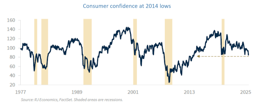 Americans have been concerned with the state of the US labor market for a while, but this concern accelerated at the beginning of 2025, with the difference between “jobs plentiful” minus “jobs hard to get” reaching the lowest level in January of this year and since the COVID pandemic recession, as shown in the graph below.